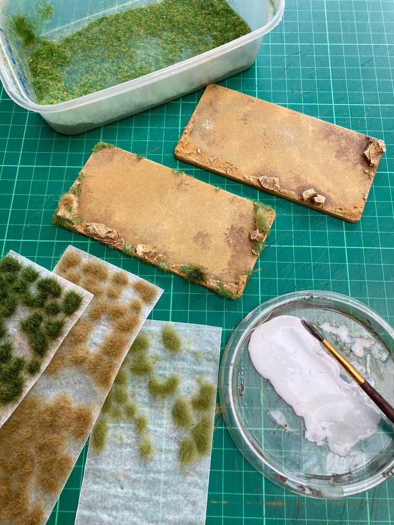 A great tip is to stick on some magnetic sheet cut to the same size as the figure bases so that you can do the flocking and tufting without messing up the minis.