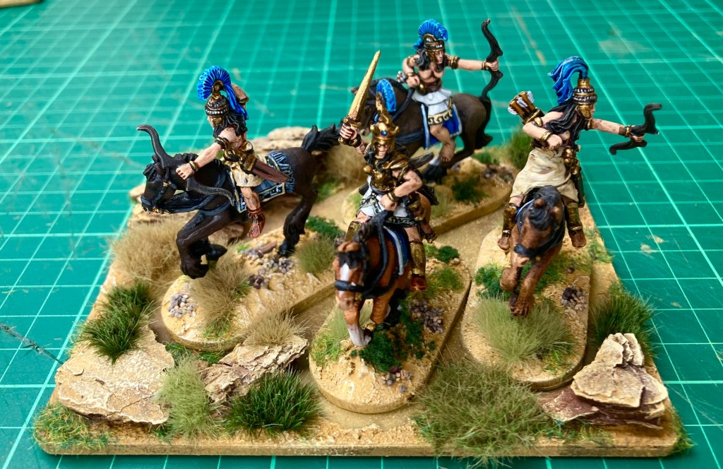 Anyway, I digress! On with the basing. It’s time for a base coat of paint to cover up that vivid green. This can be done with brushes or sponging, but I favour a quick spray of a suitable brown. If you’re really organised, you’ll match your figure basing colour to a particular spray (Army Painter Leather Brown comes to mind) which will cut down on painting time later on. I wasn’t this organised so am using a light brown in these pictures as these bases are for my Amazon Greek myth force.