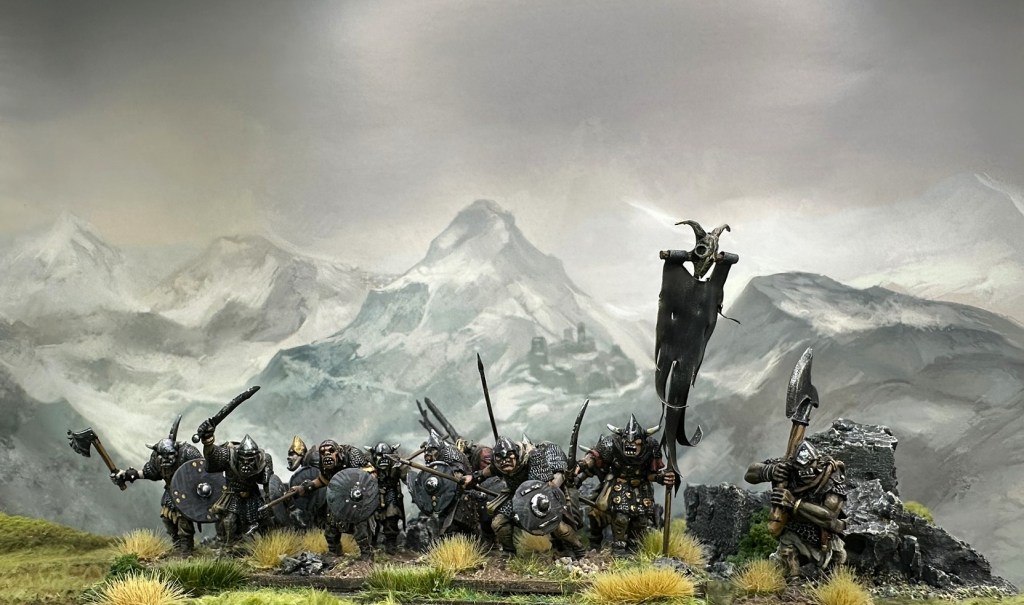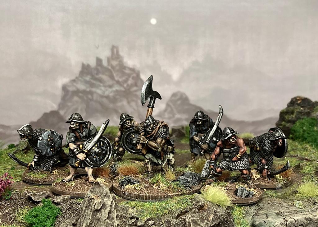 Wargames Atlantic released their Goblin kit after I’d put most of my army together, but I was still able to get some of the minis into action. Some of these have the distinctive ‘Carolingian’ style helmets used by the late Angus McBride in his iconic artwork for the Middle Earth Roleplaying game in the 1980s.