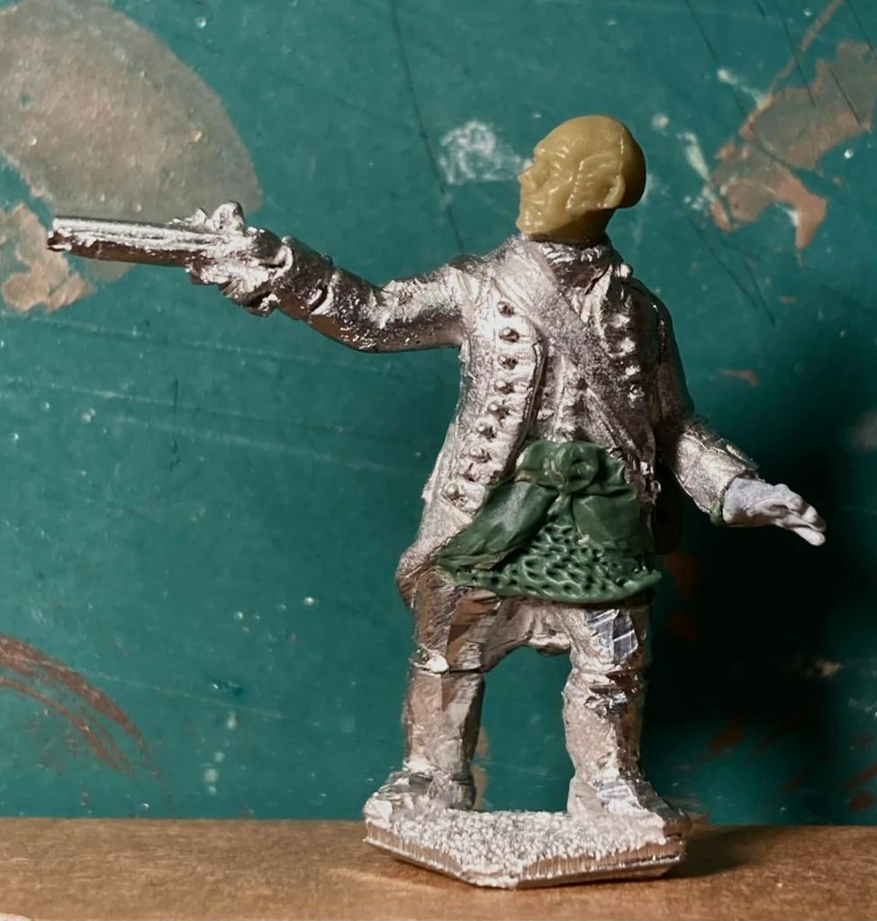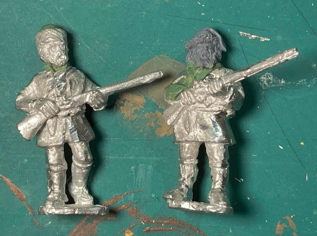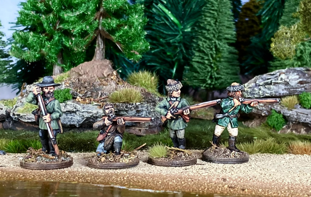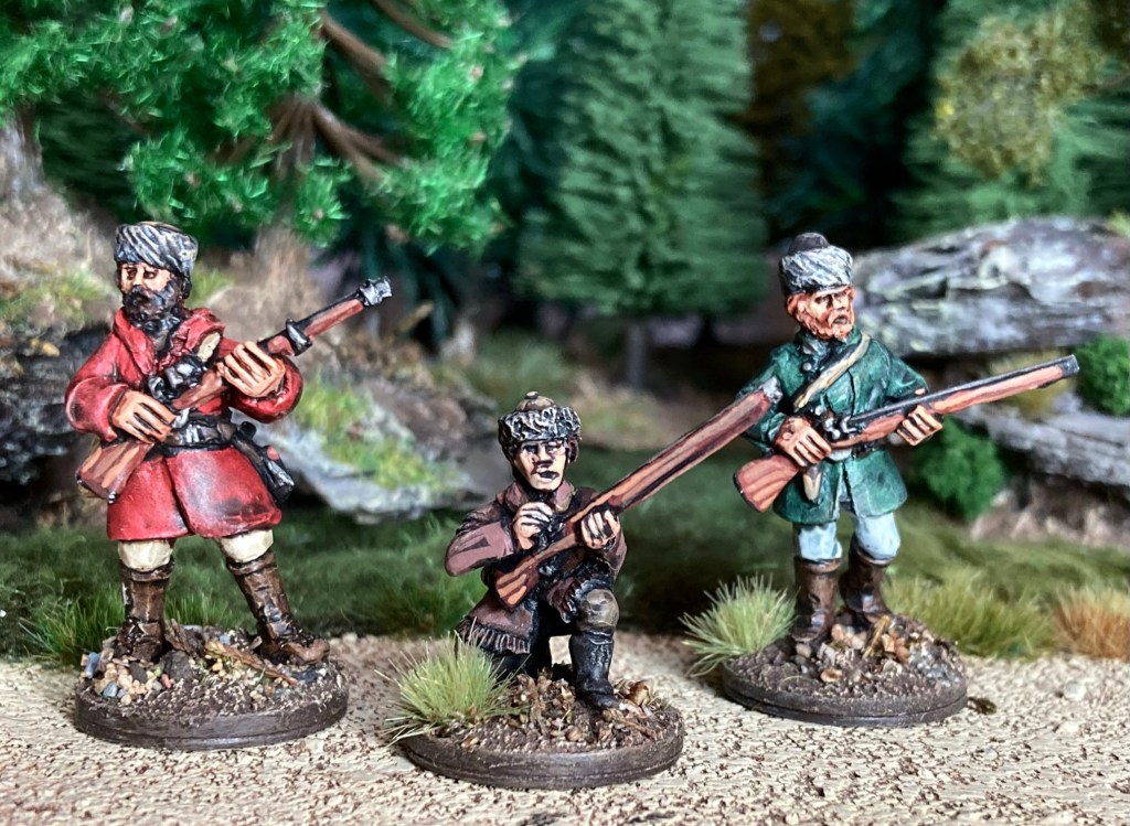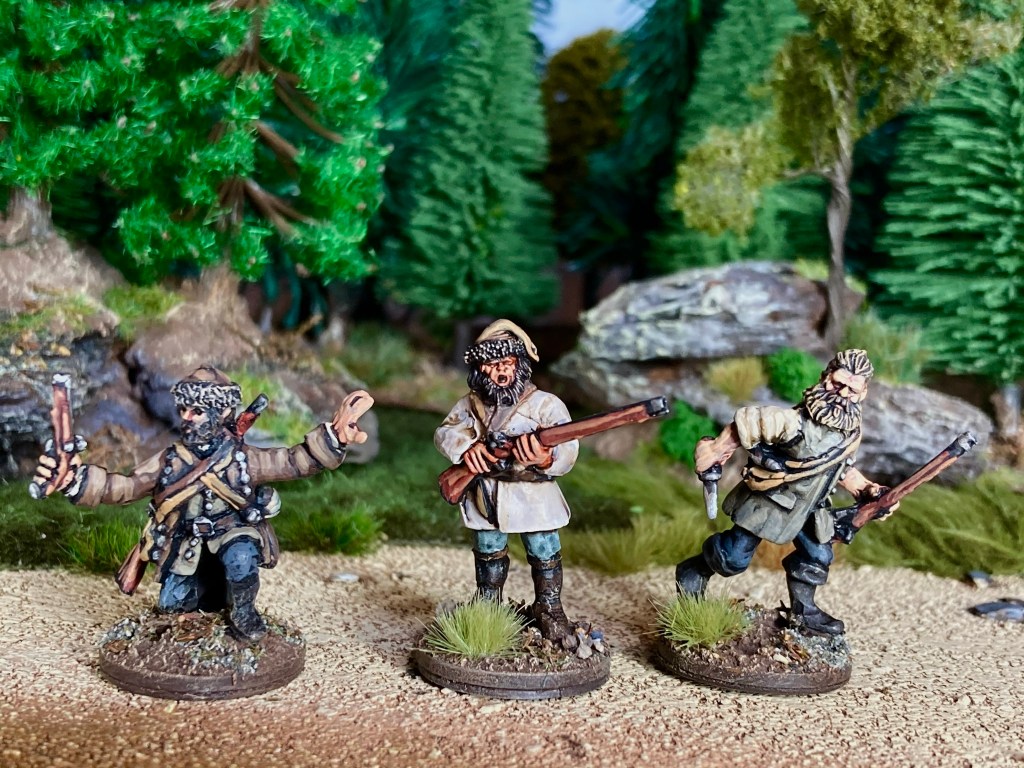 For Russians to oppose the Tlingit, I had to resort to conversions of various late 18th century miniatures. These are 28mm metal figures by Galloping Major and Kings Mountain Miniatures with some conversion work and headswaps to make them pass for Russian promyshleniki.