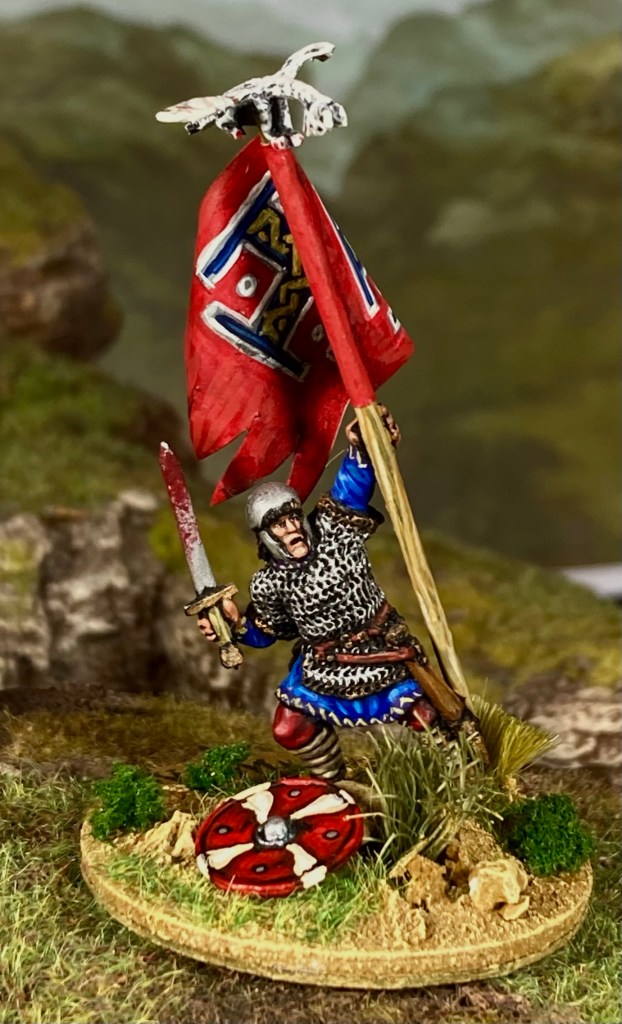 Our final character is an oldie but a goodie! This super sculpt is a very old Gripping Beast miniature by the highly talented Duncan Patten. I’ve used him as a Mercian standard bearer due to the white dragon on the banner pole, but he could serve anywhere. The flag is hand-painted with a dragon that I found in a model railway shop many years ago – apparently it was supposed to go on top of a locomotive, but has instead ended up going back a millenium and been carried into battle…