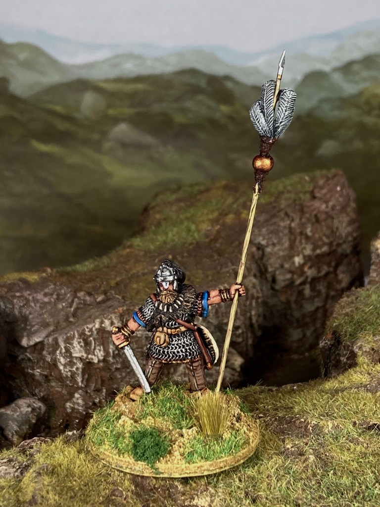 This chap is Edwin’s standard bearer. Following Bede’s description of an orb on a pole, I interpreted this somewhat loosely and made the pole massive with some substantial ostrich feathers on top! (Clearly Northumbria has good trade links with the Mediterranean).