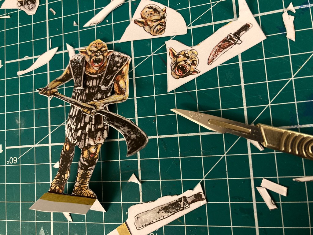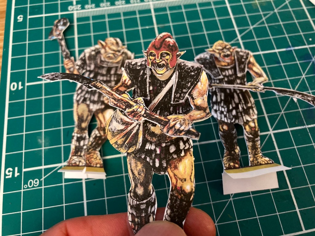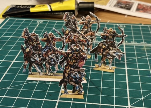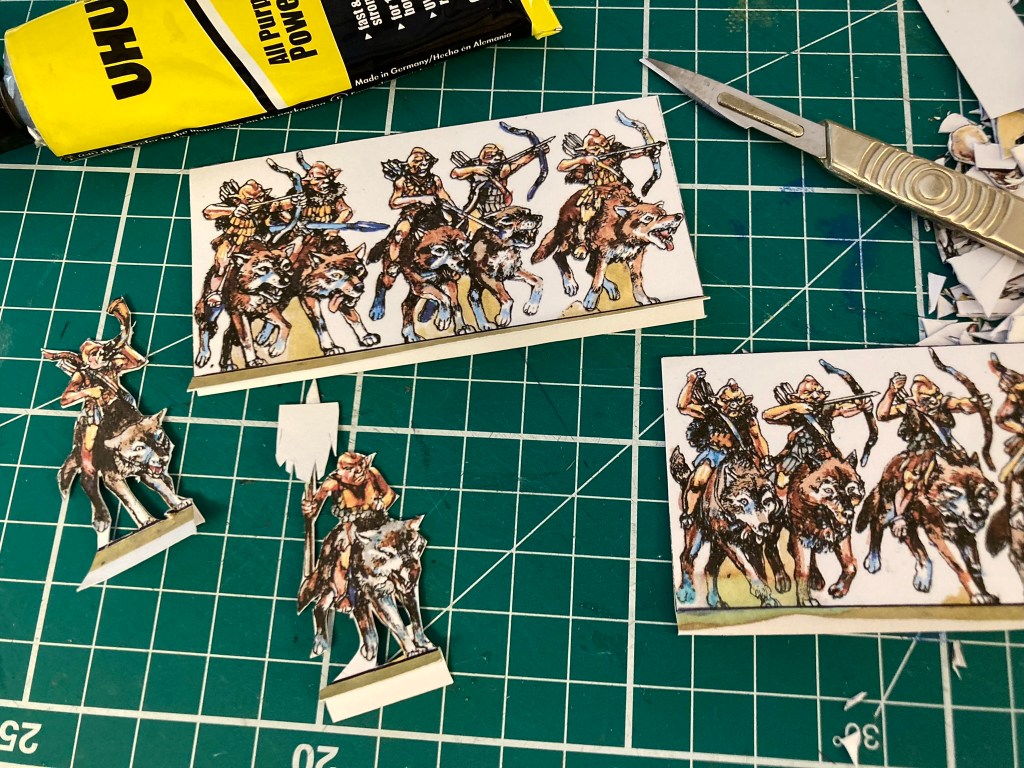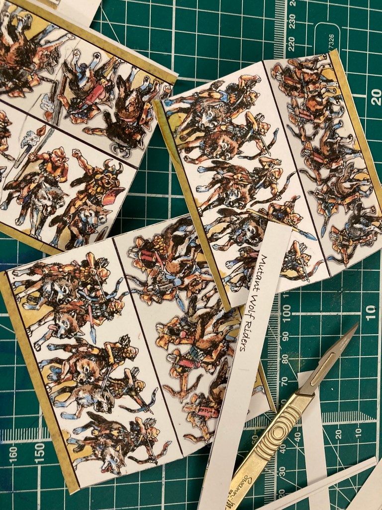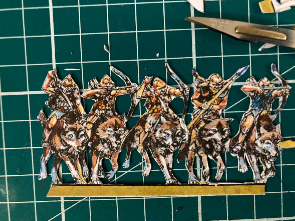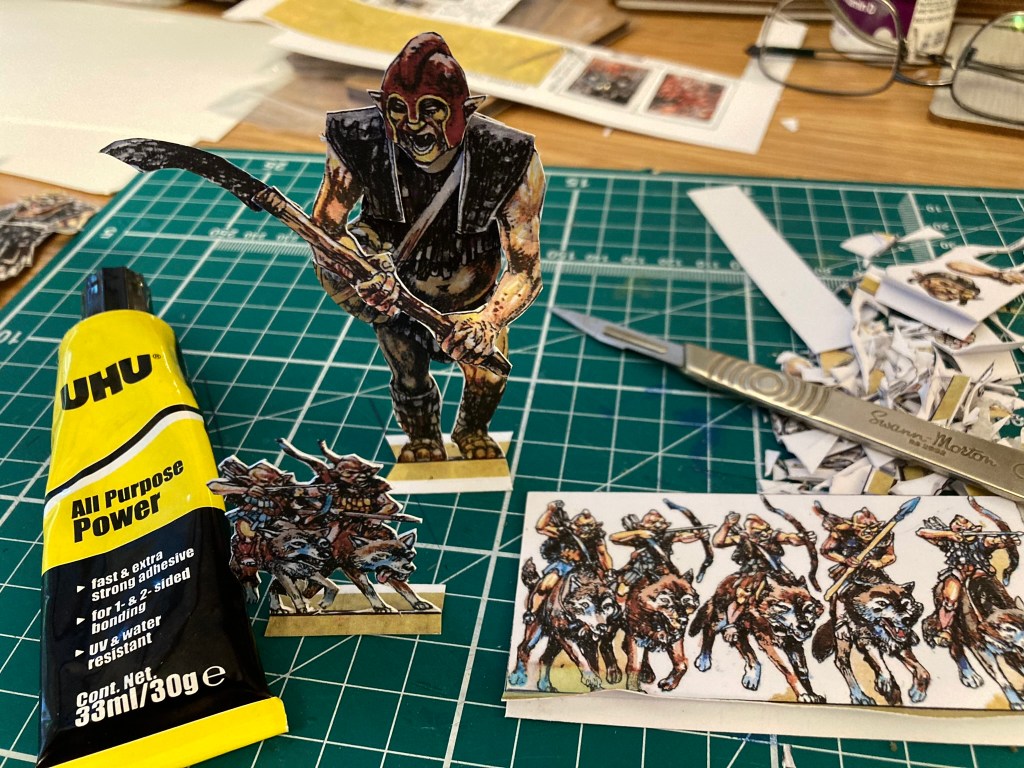 Bought as pre-coloured PDFs to download from Peter’s website, they require printing out (ideally on 160 gsm thin card) before folding, gluing and trimming. While the minis come with printable card bases, I fancied having a go at using traditional miniature basing (sand and static grass) to increase the illusion of depth.