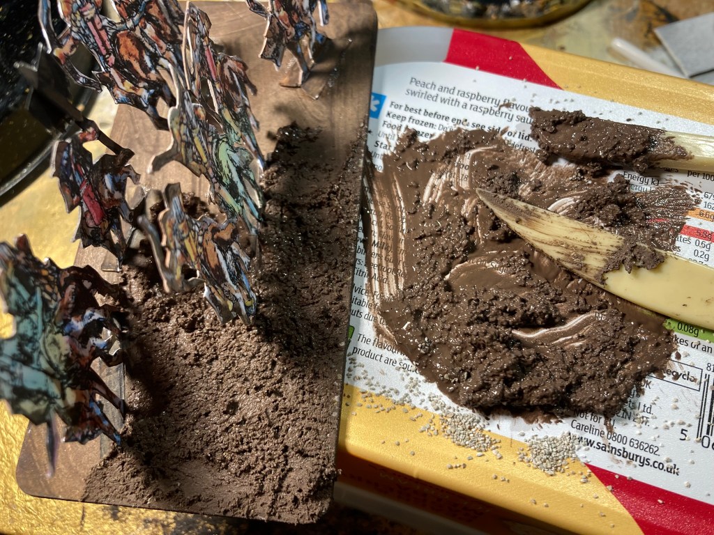 It’s a mix of Burnt Umber craft acrylic (with a touch of black), DIY filler (just a bit) and chinchilla sand, which is smeared on with a sculpting tool and left to dry.