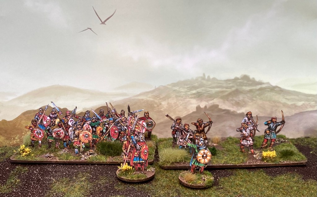 Although the majority of the 28mm range is designed to fit onto the versatile 40 x 40mm square base, I decided to combine blocks on a 120 x 60mm base suitable for Midgard Heroic Battles. I spent some time arranging the ranks and individuals for visual effect on the bases (2mm round cornered MDF from Warbases).