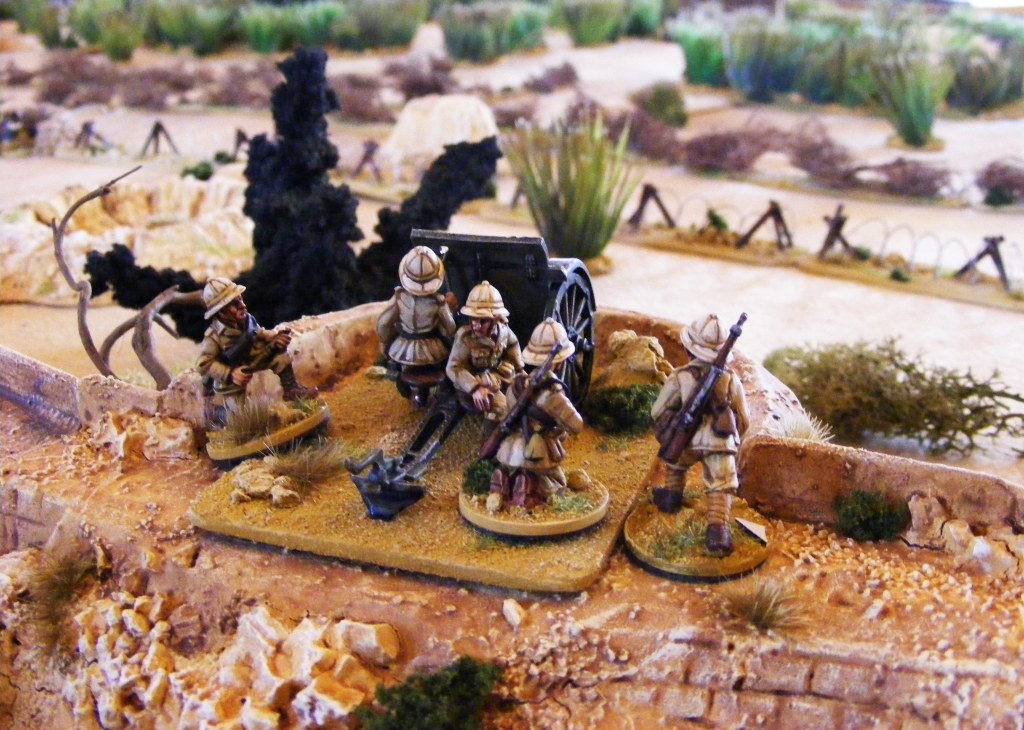 Our game features a variety of 28mm models, mostly Perry Miniatures for the British and Empress Miniatures for the Italians, with a few Perry, Warlord and Askari Miniatures as well. The British Vickers Wellesley bomber is an ancient Matchbox kit from the 1970s; the elephant grass is made from aquarium plants; and the fort has been scratch built. We are using the ‘I Ain’t Been Shot, Mum’ rules for WW2 by Two Fat Lardies with a few modifications and a ruler marked with ‘big inches’!