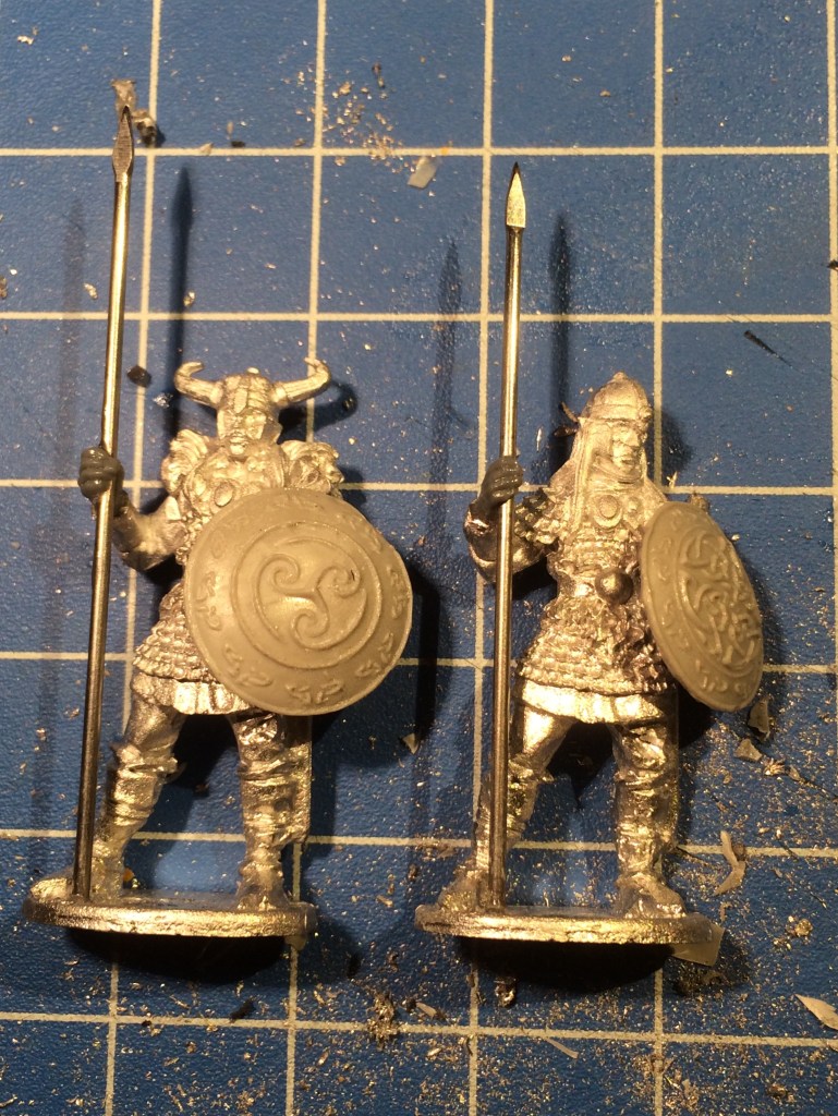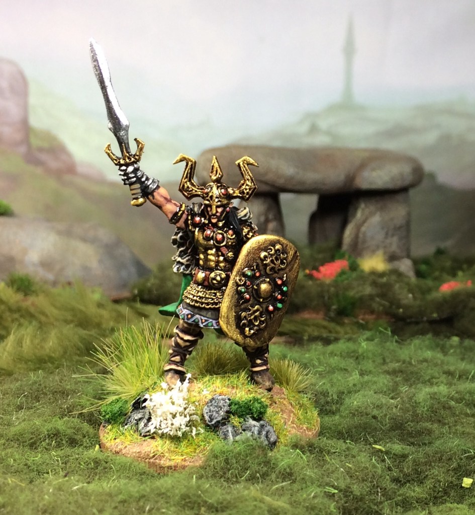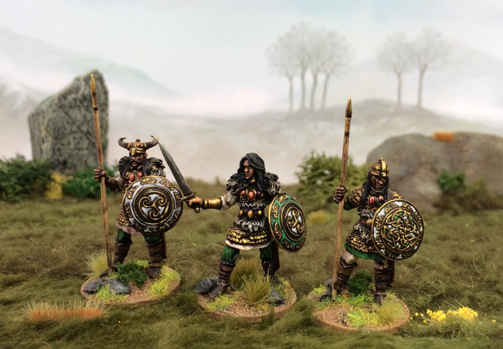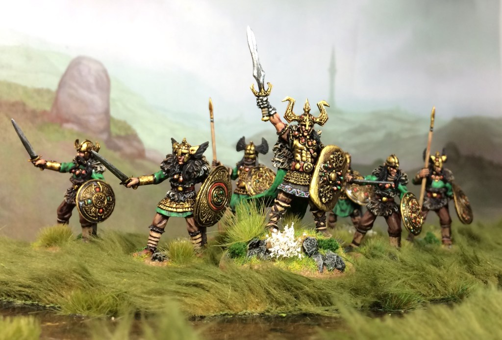 I wanted an even more Celtic feel to my elf warband, so I added some resin shields ordered from Scibor Miniatures. Although I love the elf minis by Steve Saleh, they are only supplied with metal cast spears (annoyingly cast as one piece into a separate hand, which makes replacing them tricky)… this led to me deciding to replace some with swords (using spare plastic hands and swords from the Oathmark plastic elves) and replacing the rest with more plastic hands drilled out to take metal Northstar spears. Fiddly, but worth it, I think!