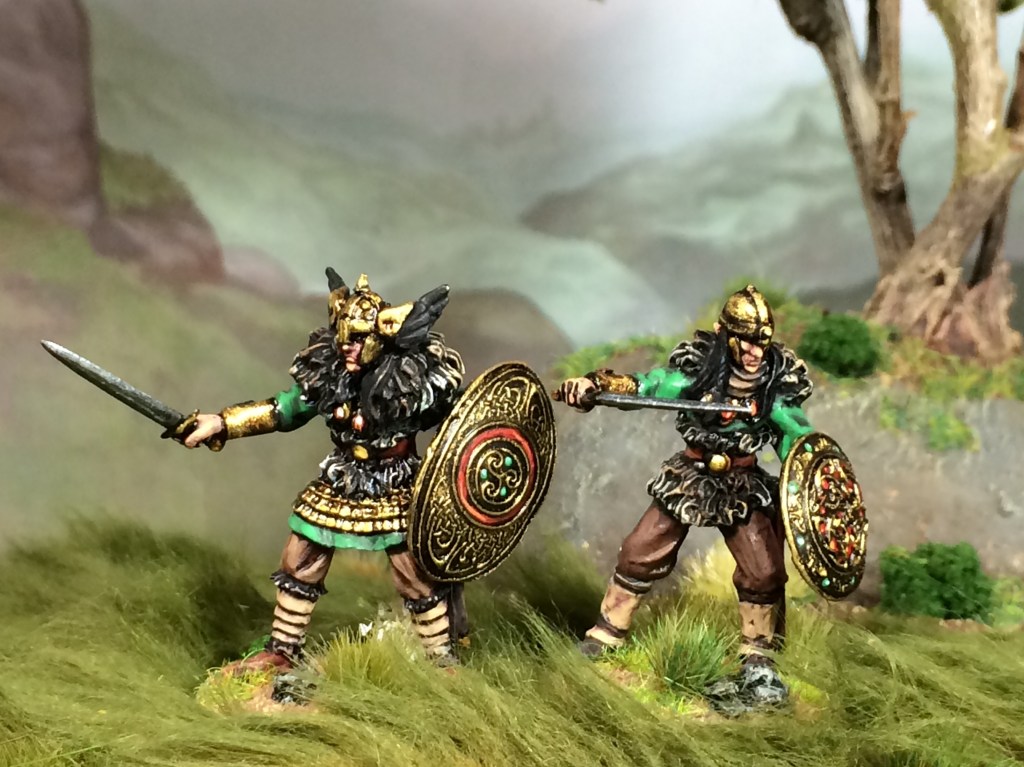 On the left is the Vachel Goldenhand figure from Lucid Eye, although as you can see, I gave him a silver hand so that he can double up as Nuada of the Silver Arm from Celtic myth! The elves are highly stylised, drawing equally upon the artwork of Jim Fitzpatrick and Rodney Matthews. Vachel is one of the many thanes (leaders) in the Red Book of the Elf King, each of whom have their own circle of 18 companions (six groups of three models in the game). The companion models are generic, so I just painted up 18 and use them interchangeably with whichever thane I feel like playing that week!