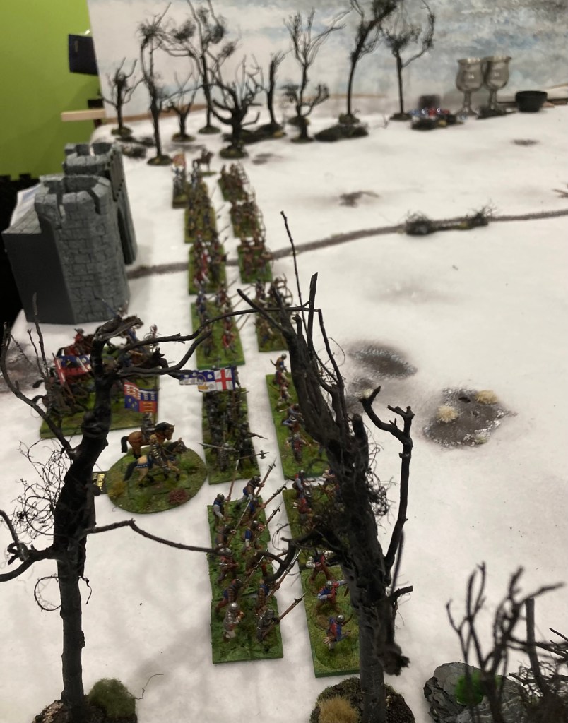 Although none of the chroniclers mentioned snow, running a battle set in December 1460 was too good an opportunity to pass up, so one of my homemade snow mats was pressed into service (making a reappearance from the Norse myth games that appear in the Midgard rulebook) along with the winter trees that Chris and I had made for our Battle of Mortimer’s Cross game in 2022. Tom happened to have the gatehouse of Helm’s Deep on the shelf, which was quite passable for the gates of Sandal Castle. The backdrop at the end of Tom’s table was painted by me ten years ago for a World War One game but seemed to fit the mood well enough!