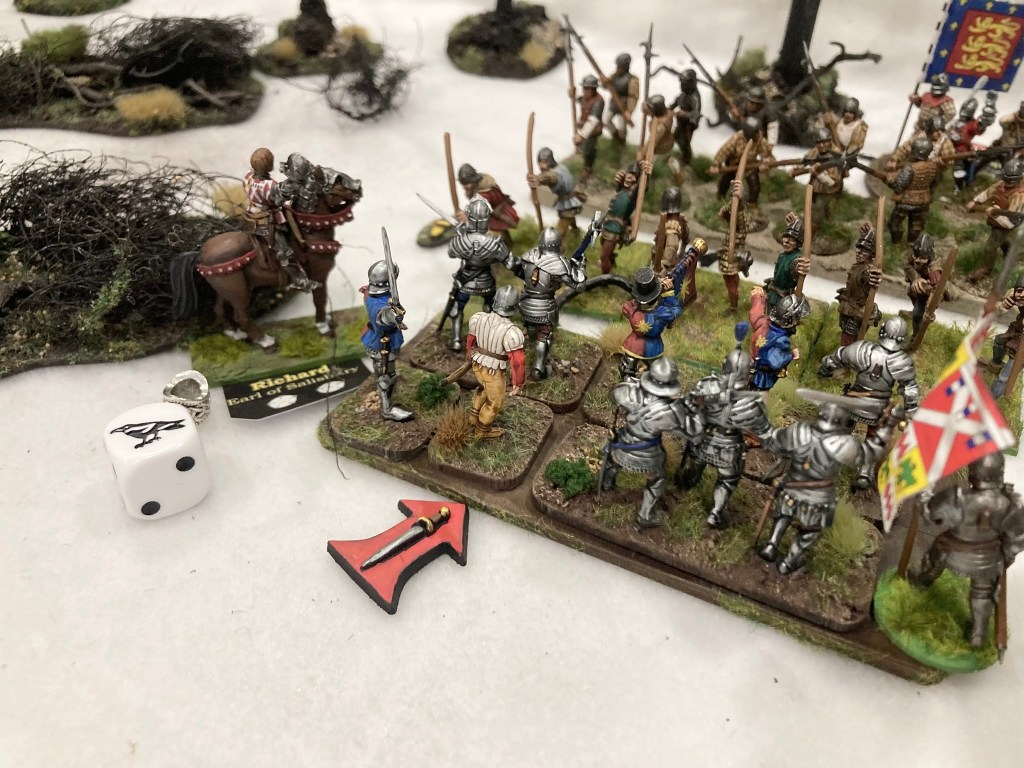 On the other flank, Lord Roos and his knights had charged the Yorkist billmen in an effort to fight their way through to Rutland. The combat was indecisive, but Roos also failed a Risk to Heroes test and was wounded. (You might be wondering why Roos and Salisbury weren’t using their Mighty Deeds to reroll the Risk to Heroes tests: the answer is that they didn’t have any, having blown them all urging troops into position earlier in the Turn!)