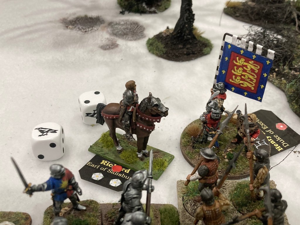 On the Yorkist left, Salisbury was effectively acting as a forlorn hope to try to hold up the Lancastrian flank attack coming in from the woods. Never one to be afraid of taking bold action, Tom took York with his men-at-arms and sent them onto a pre-emptive strike into Exeter’s archers on the edge of the woods. The Yorkists took first blood, but Salisbury received a blow to the head in the melee, failing his Risk to Heroes test!