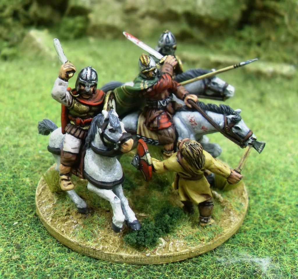 Although Y Gododdin contains what appears to be a wealth of military detail, it is unclear what actually happened at the Battle of Catraeth. Parts of the poem describe cavalry combat, others appear to refer to infantry battle, and there are even references to fighting in fortifications (the famous line: He fed black ravens on the rampart of a fortress/ Though he was no Arthur.) There are many varying interpretations, and for the sake of our game I’ve followed the narrative suggested by Rosemary Sutcliff in her novel The Shining Company.